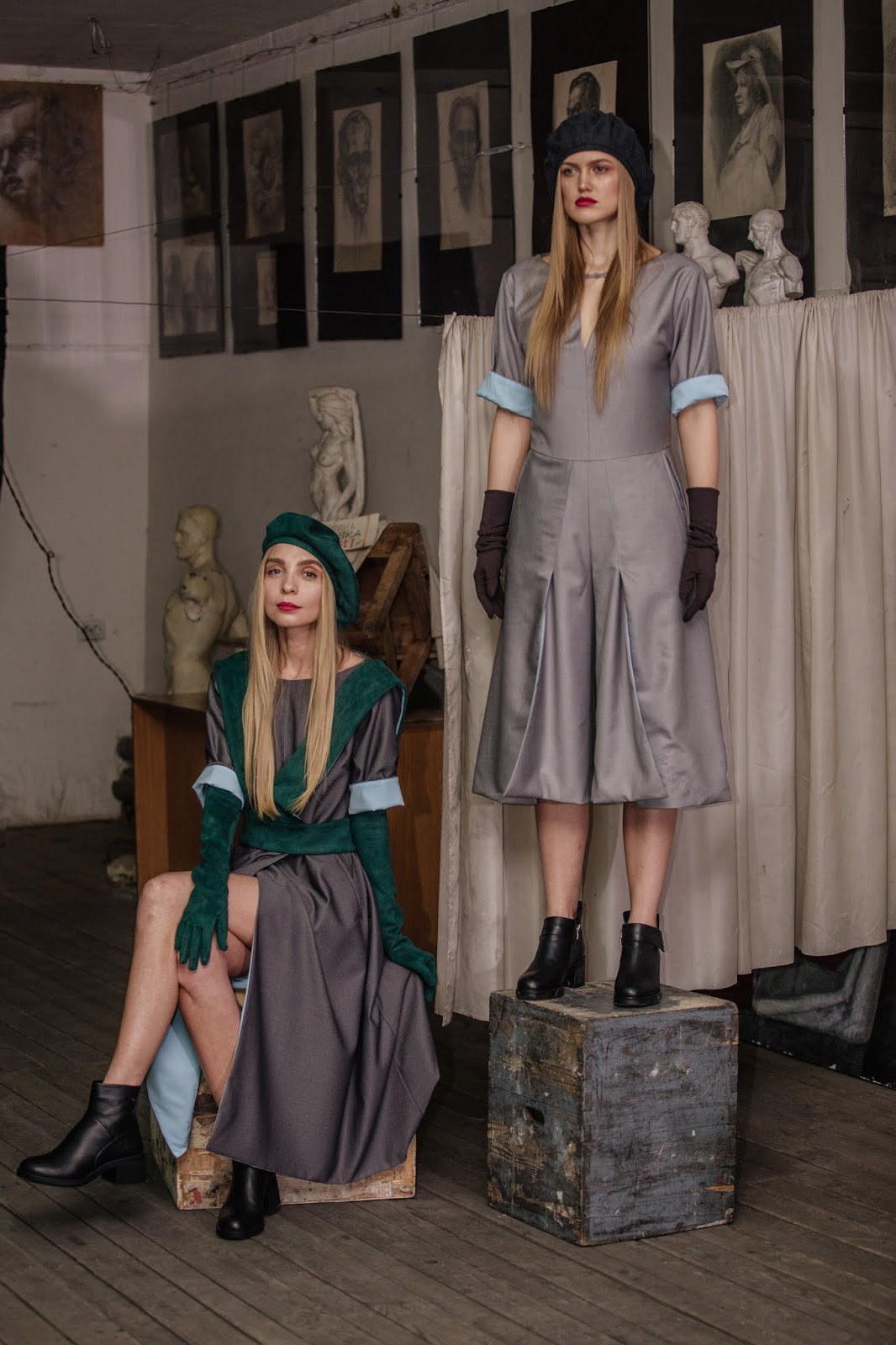 Колекція AW 2019/20 — це 10 образів. Сукні, спідниці, светри, блузки, комбінезони в сіро-синій гамі з блакитною підкладкою та оранжевими акцентами.